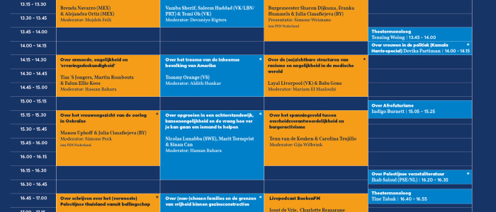 Exploring Stories is voor deze vierde editie een weekender geworden, met meer dan 25 internationale schrijvers in 4 zalen, signeersessies, muziek en gesprekken over de grote thema’s van onze tijd. Op zaterdag belichten we politieke en maatschappelijk-sociale onderwerpen in al hun gelaagdheid. Met onder andere: Svetlana Alexijevitsj (Belarus), Constance Debré (Frankrijk), Layal Liverpool (VK), Nicolas Lunabba (Zweden), Alejandra Ortiz (Mexico), Brenda Navarro (Mexico), Vamba Sherif (Nederland), Tommy Orange (VS), Tim 'S Jongers (Nederland), Julia Cimafiejeva (Belarus), Manon Uphoff (Nederland), Saleem Haddad (VK/Libanon/Portugal), Temi Oh (VK), Ihab Saloul (Palestina/Nederland), Indigo Burnett (Nederland), Saskia de Coster (België), Teun van de Keuken (Nederland), Carolina Trujillo (Nederland) en Devika Partiman (Nederland).