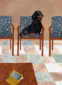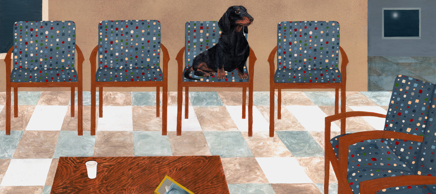 ‘Kan ik je zo even terugbellen? We hebben nóg een teckel gekocht. Een miniteckel, met kleine vlekken op zijn oren. Hele schattige hangoren. Misschien is het een beetje een mix? Die krijg je hier gewoon bij de supermarkt. Maar hij heeft een hoestje. We komen net aan bij de dierenarts.’