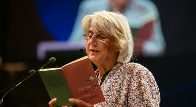 Levenslust is een passende titel voor een dichtbundel als je Joke van Leeuwen, van wie voor de 39ste Nacht van de Poëzie dit jaar de nachtregel afkomstig was, op het podium voor ziet dragen. Zodra ze van wal steekt raakt ze in een stroomversnelling van woorden die maar associatief voort blijven vloeien. Tot ze richting het eind snelheid vermindert, haar woorden "langzaam als wolken dikte verliezend."