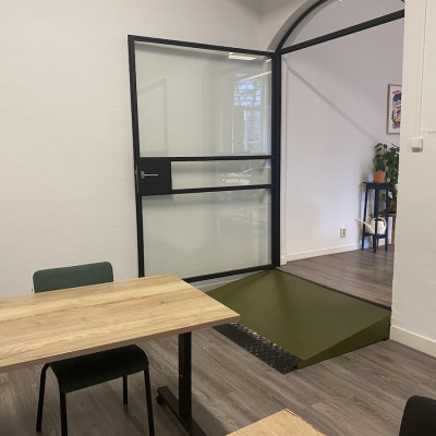 De twee drempels die een bezoeker moet nemen om in de cursusruimte of bij het toilet te komen zijn te zien op de onderstaande afbeeldingen.